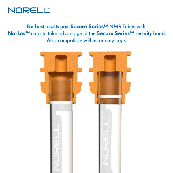 Secure Series™ NMR Tubes ship with our patented NorLoc Caps™ featuring a Security Band™ that engages and locks into the NorLoc II Security Cap™, securely joining the cap to the NMR tube.